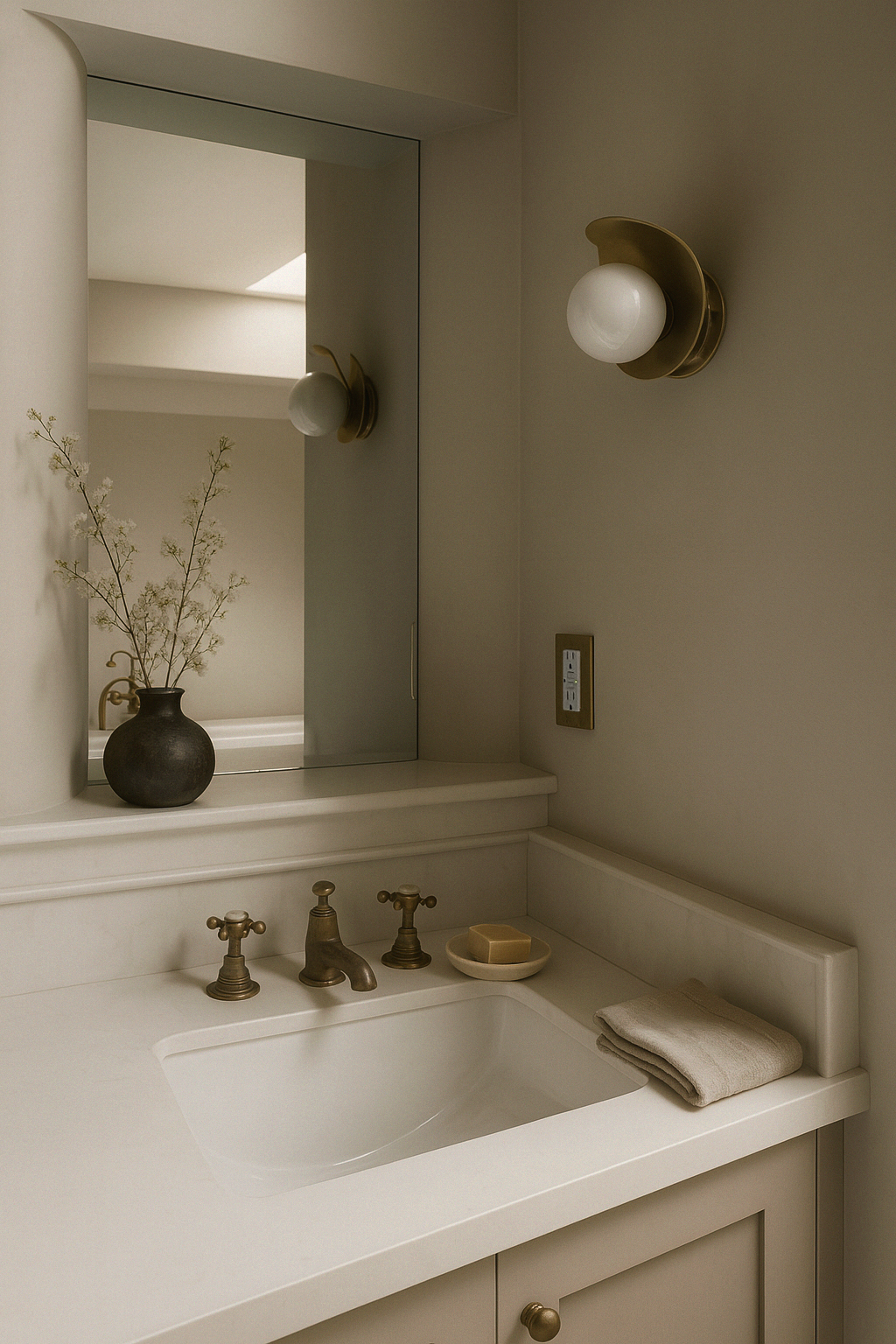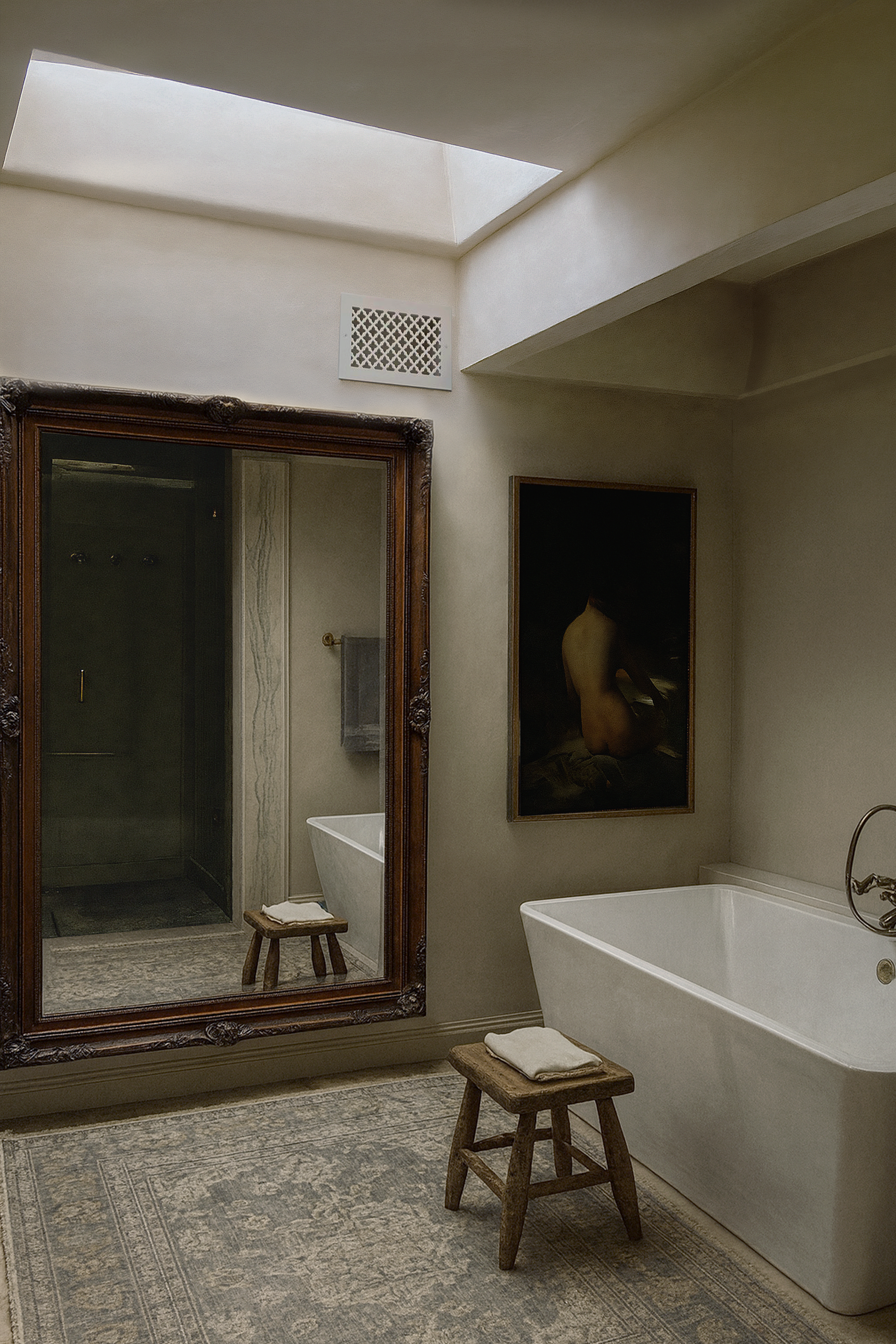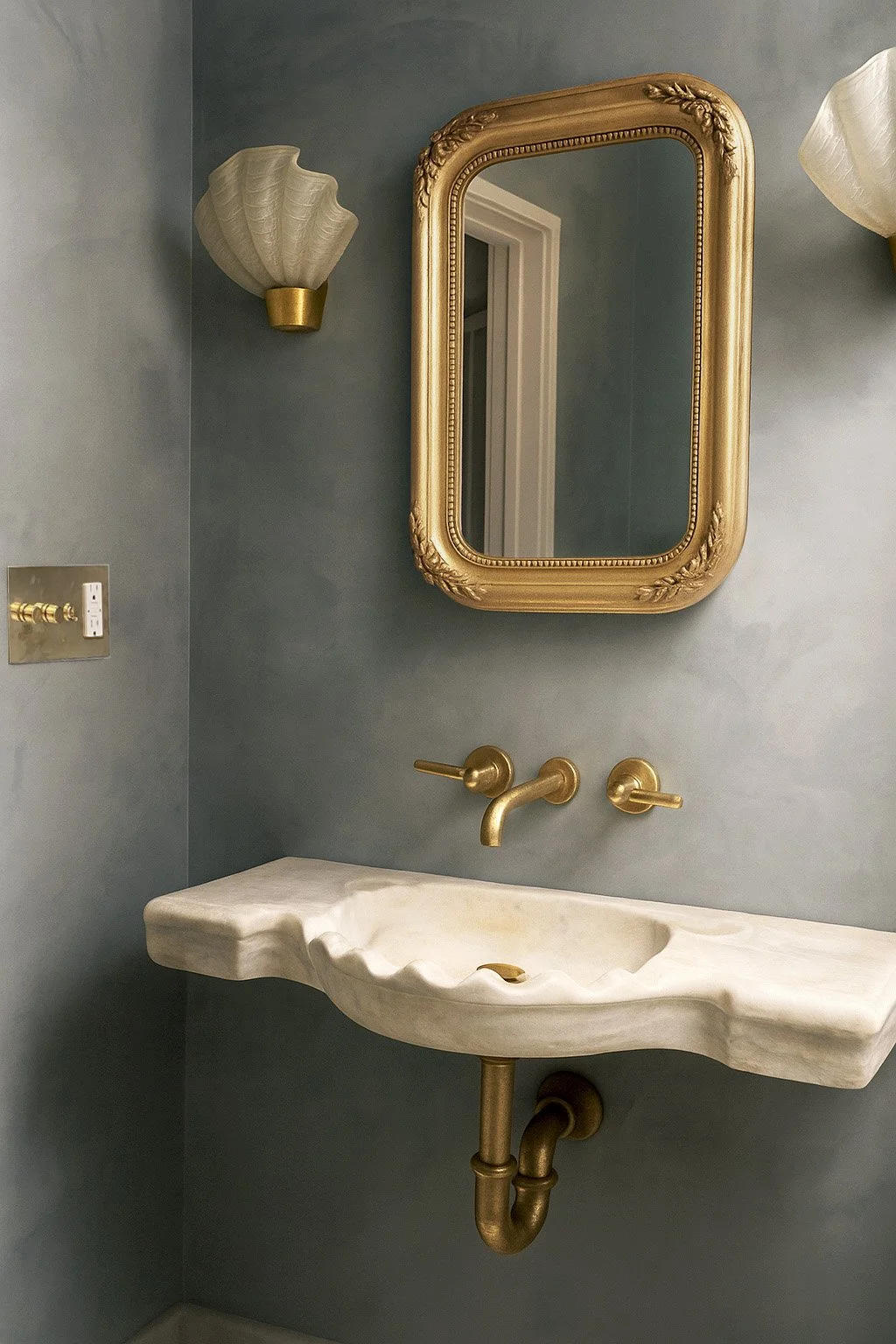 Mood board and color palette for primary bath. Inspired by salty skin, the pillowing curves of sea conch, cascading water, and warm earth.